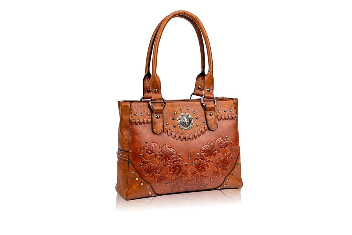 LAVAWA tote bag combines vintage embossed design with practicality. It features a top handle and shoulder strap, perfect for daily use. Its western concho studs add a classy touch to any outfit.